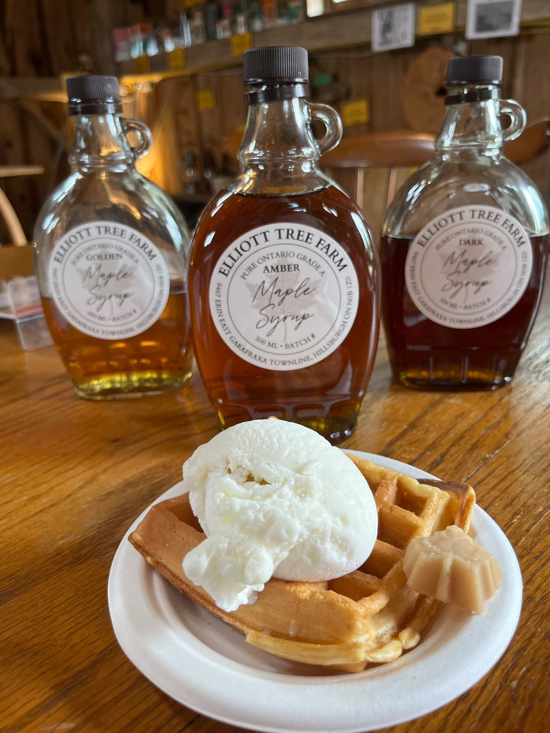 - 'Elliott Tree Farm Sandwich': A warm waffle with ice cream and our award-winning maple syrup